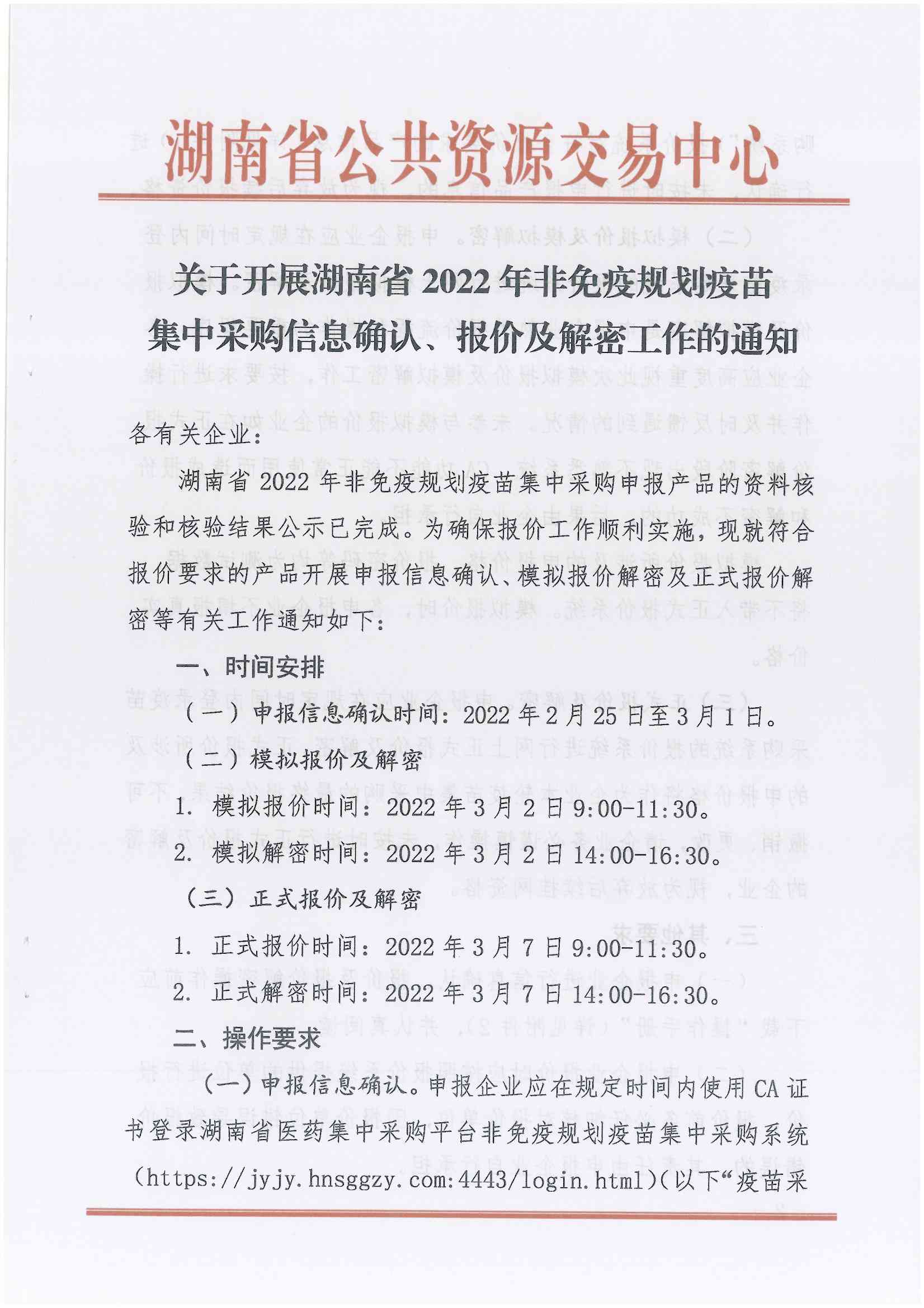 【湖南】关于开展湖南省2022年非免疫规划疫苗集中采购信息确认、报价及解密工作的通知
