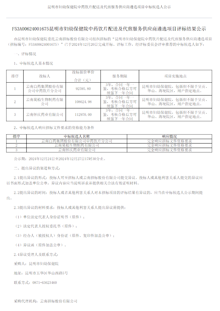 【昆明市妇幼保健院】云南省昆明市妇幼保健院中药饮片配送及代煎服务供应商遴选项目中标候选人公示