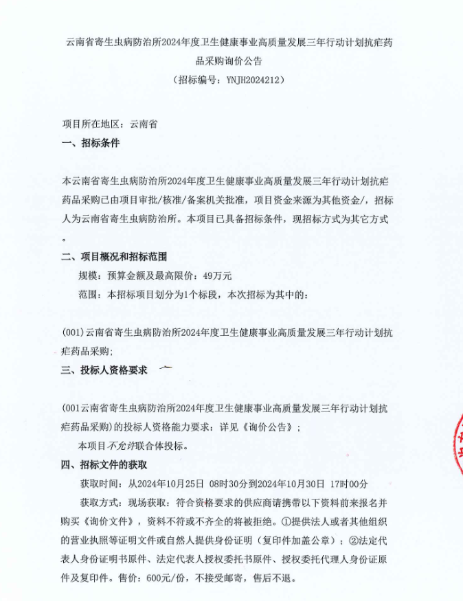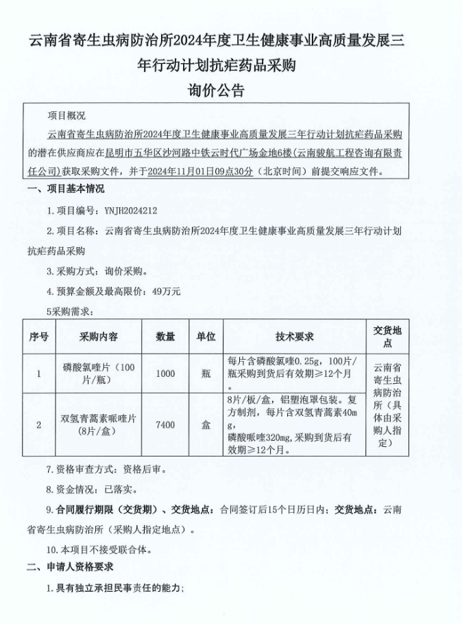【云南省寄生虫病防治所】云南省寄生虫病防治所2024年度卫生健康事业高质量发展三年行动计划抗疟药品采购询价公告