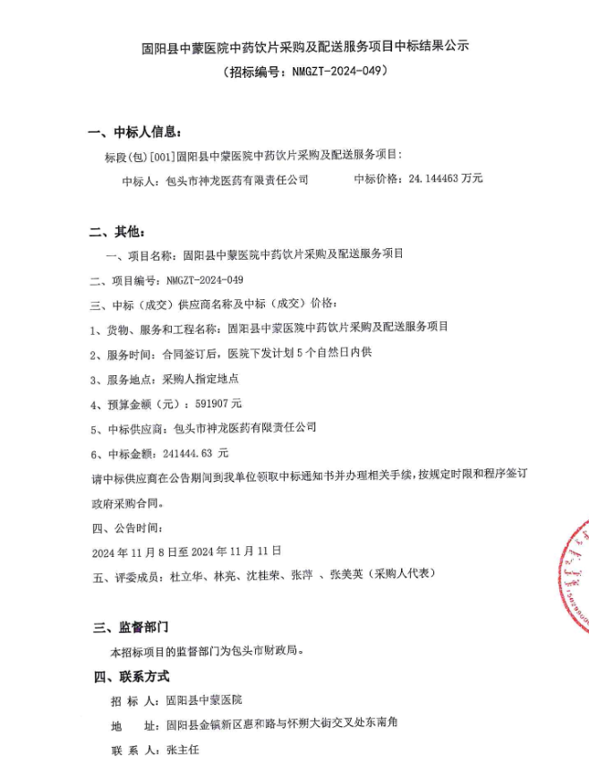 【包头市固阳县中蒙医院】内蒙古自治区包头市固阳县中蒙医院中药饮片采购及配送服务项目中标结果公示