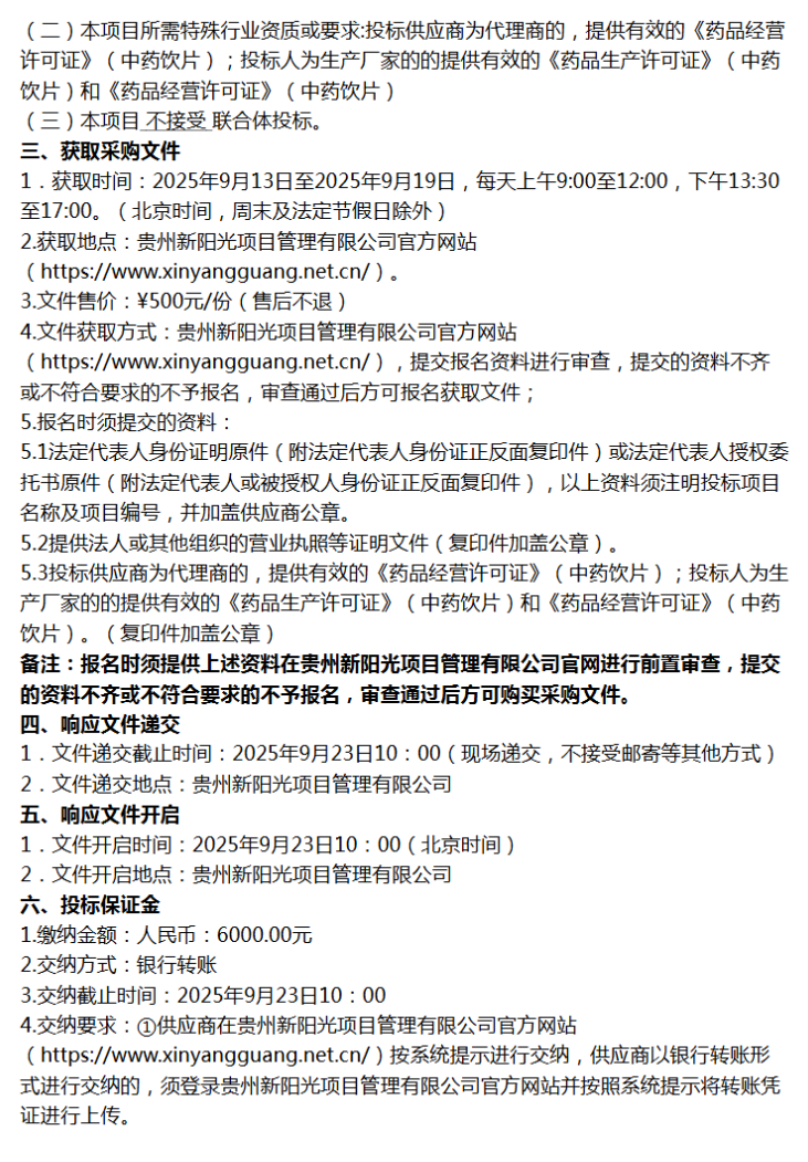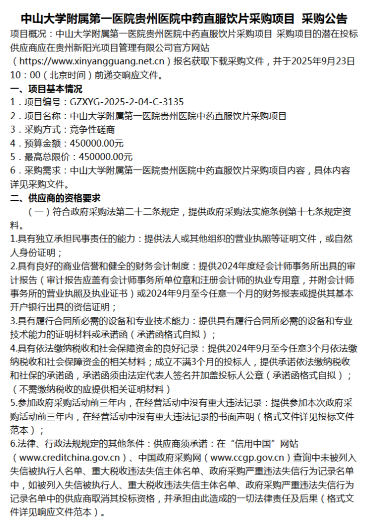 【中山大学附属第一医院贵州医院】贵州省中山大学附属第一医院贵州医院中药直服饮片采购项目采购公告