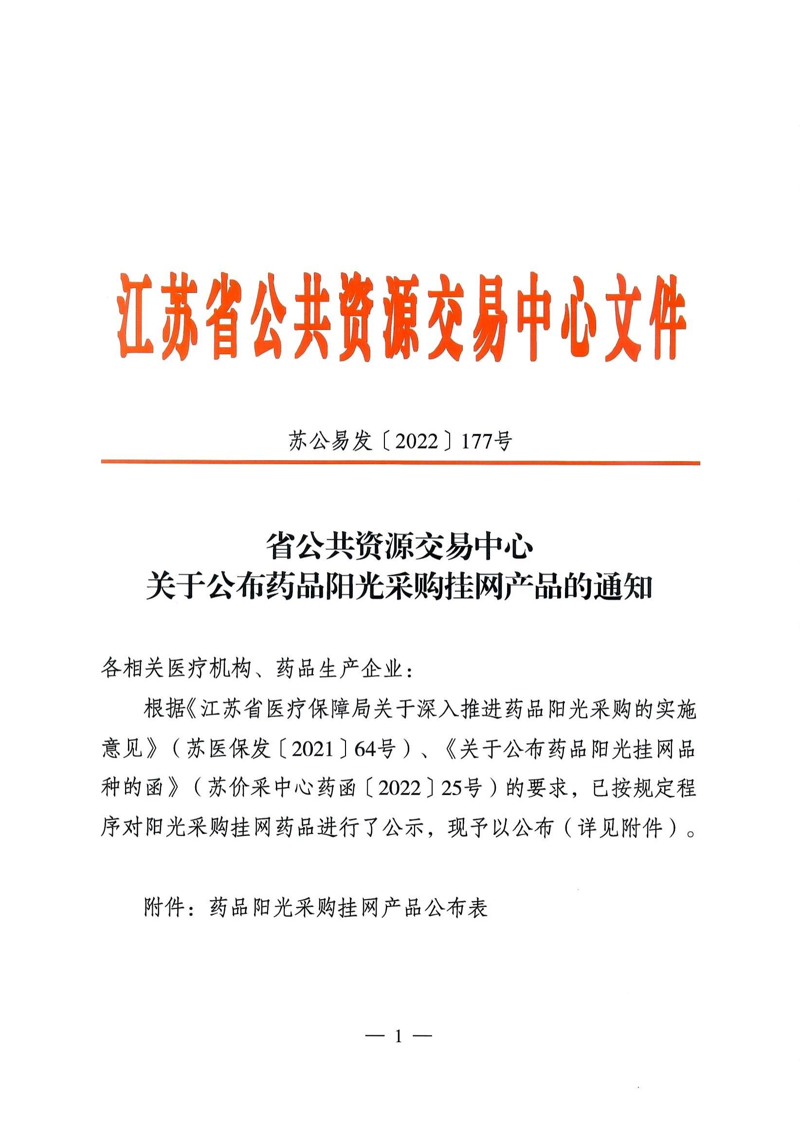 【江苏】省公共资源交易中心关于公布药品阳光采购挂网产品的通知