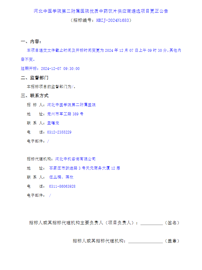 【河北中医学院第二附属医院】河北中医学院第二附属医院优质中药饮片供应商遴选项目更正公告