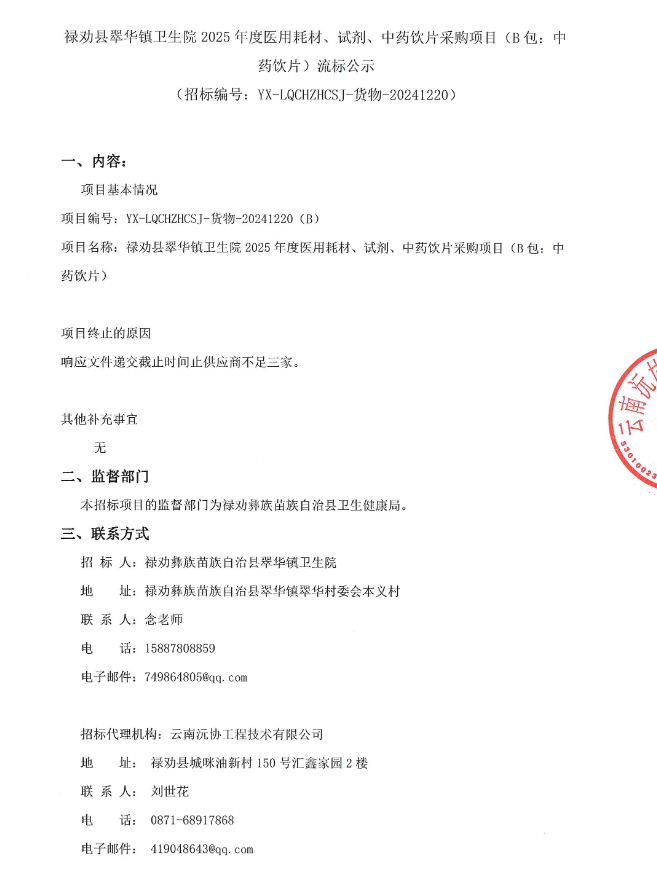 【昆明市禄劝县翠华镇卫生院】云南省昆明市禄劝县翠华镇卫生院2025年度医用耗材、试剂、中药饮片采购项目(B包:中药饮片)流标公示
