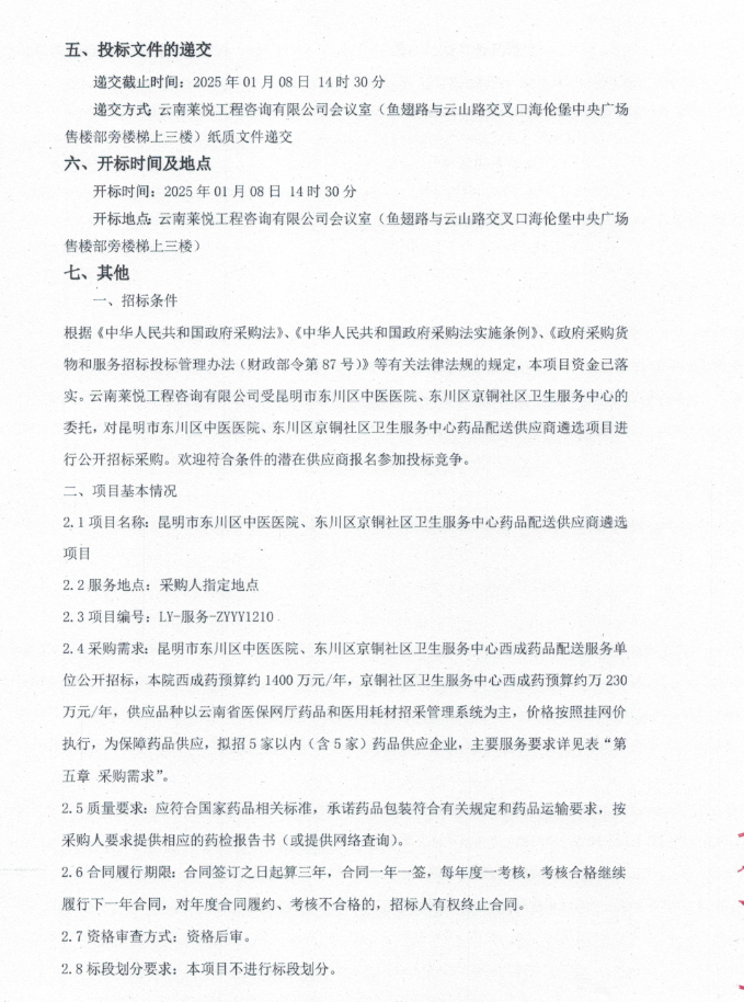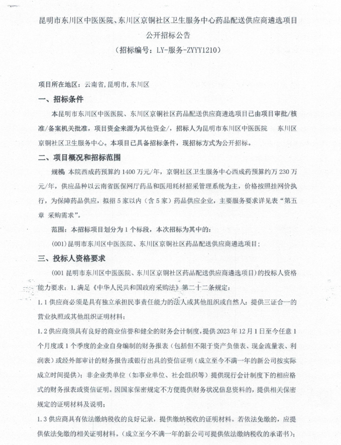 【昆明市东川区中医医院】云南省昆明市东川区中医医院、东川区京铜社区卫生服务中心药品配送供应商遴选项目公开招标公告