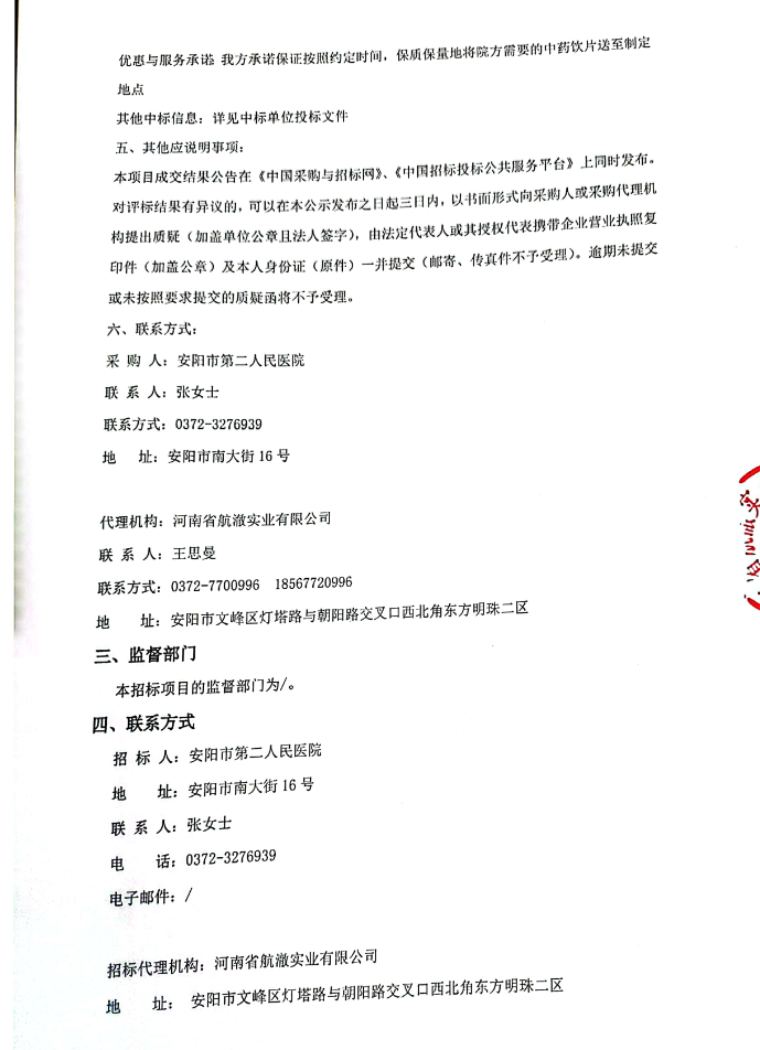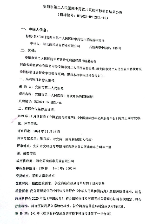 【安阳市第二人民医院】河南省安阳市第二人民医院中药饮片采购招标项目结果公告