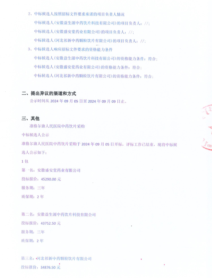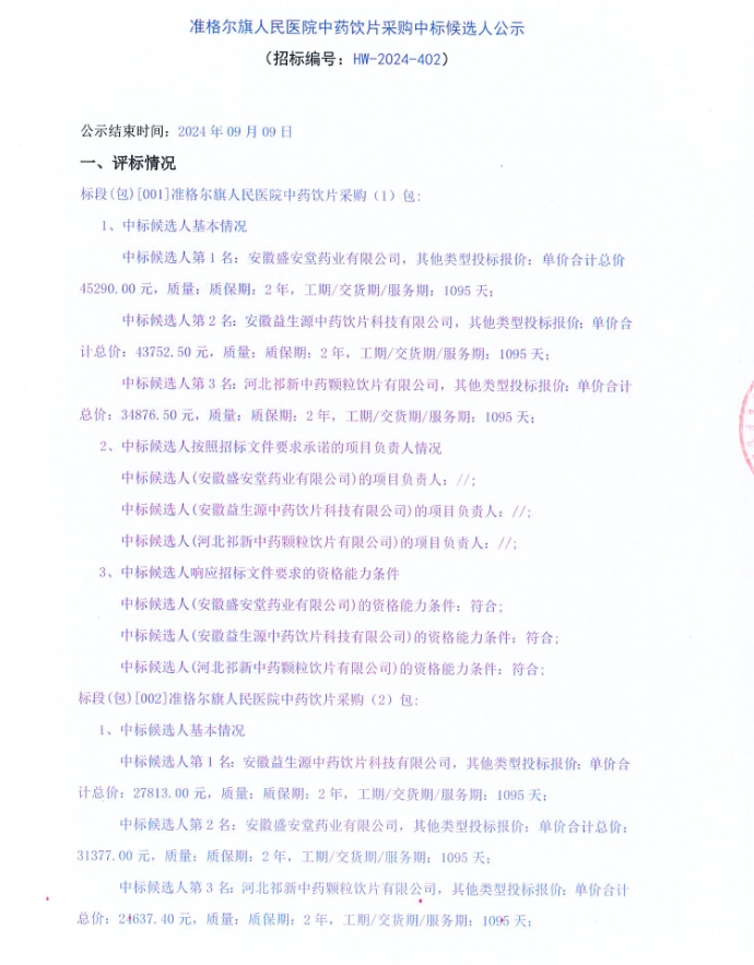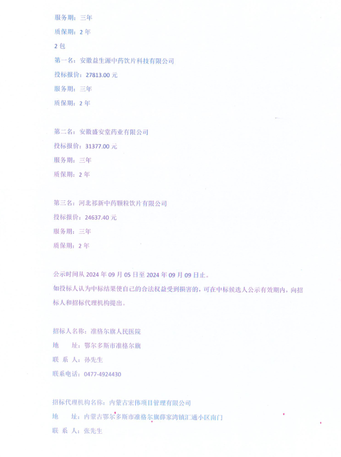 【鄂尔多斯市准格尔旗人民医院】内蒙古自治区鄂尔多斯市准格尔旗人民医院中药饮片采购中标候选人公示