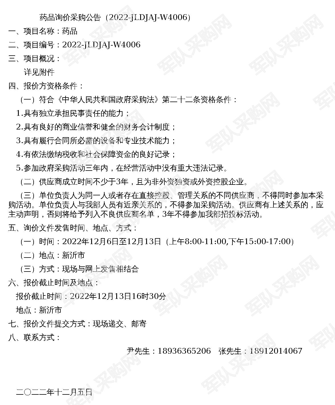 【军队采购】军队采购网药品询价采购公告(2022-JLDJAJ-W4006)