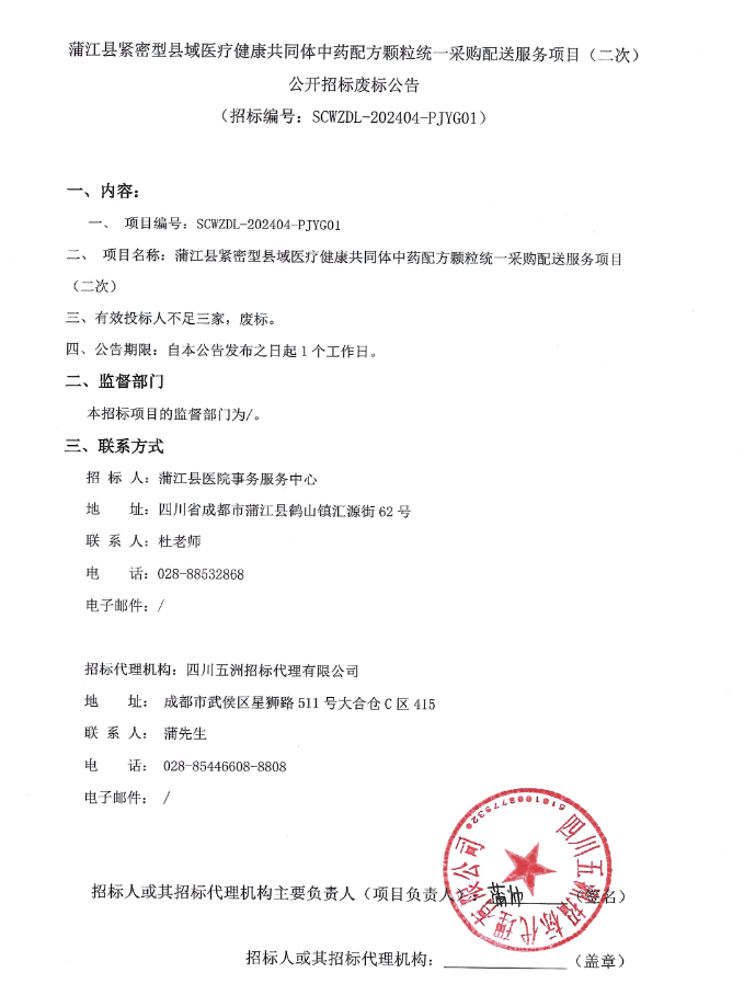 【蒲江县医院事务服务中心】四川省成都市蒲江县紧密型县域医疗健康共同体中药配方颗粒统一采购配送服务项目(二次)公开招标废标公告