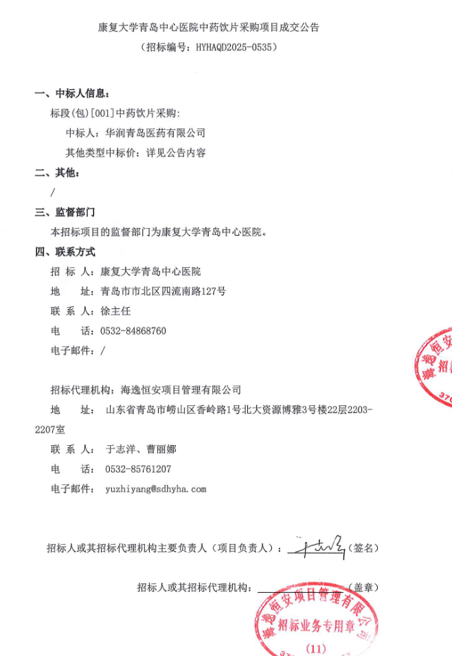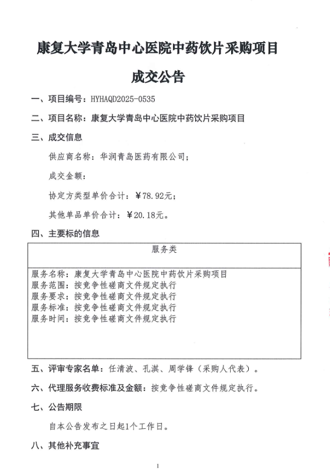 【青岛中心医院】山东省康复大学青岛中心医院中药饮片采购项目成交公告