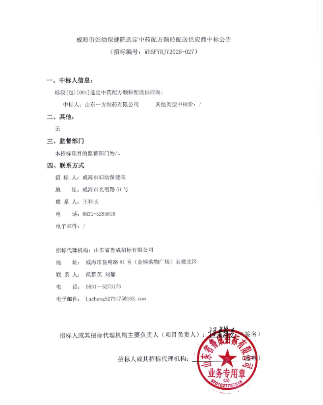 【威海市妇幼保健院】山东省威海市妇幼保健院选定中药配方颗粒配送供应商中标公告