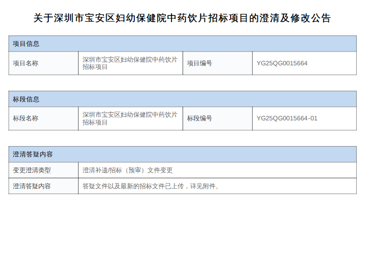 【深圳市宝安区妇幼保健院】广东省关于深圳市宝安区妇幼保健院中药饮片招标项目的澄清及修改公告