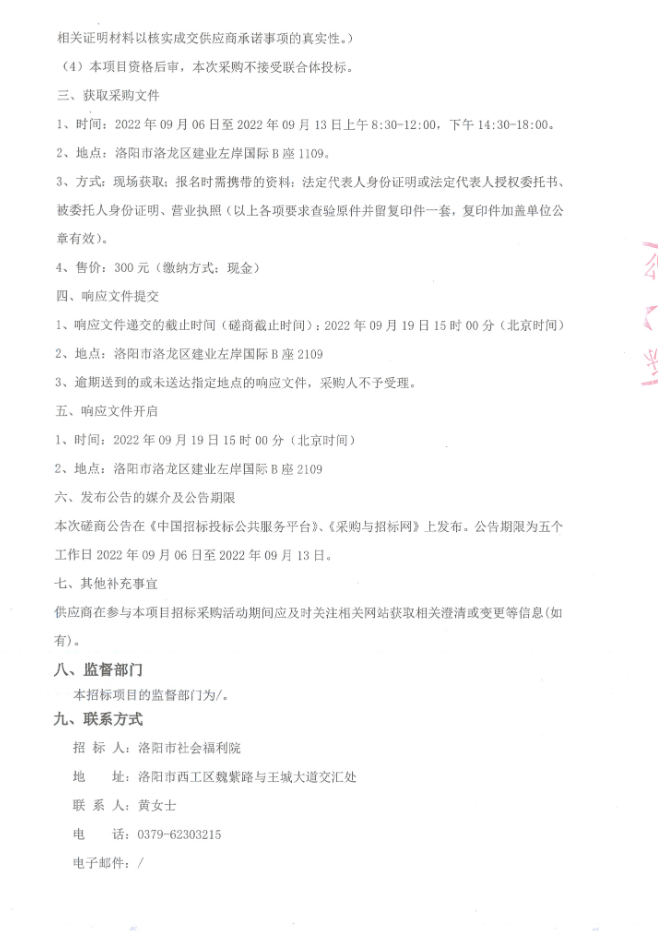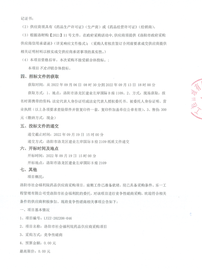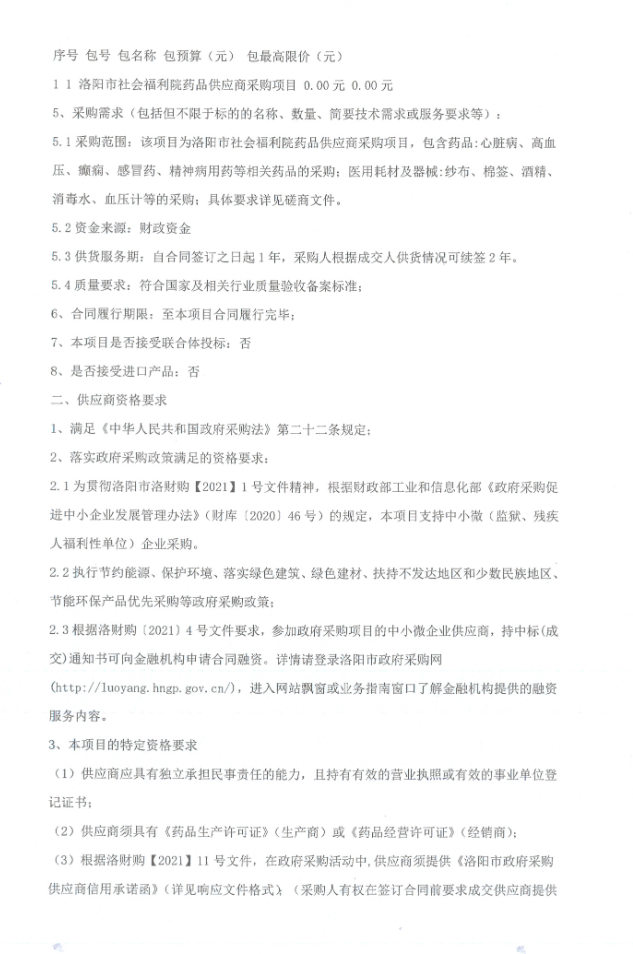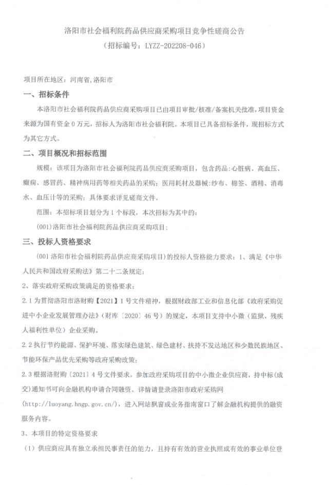 【河南省洛阳市社会福利院】药品供应商采购项目竞争性磋商公告