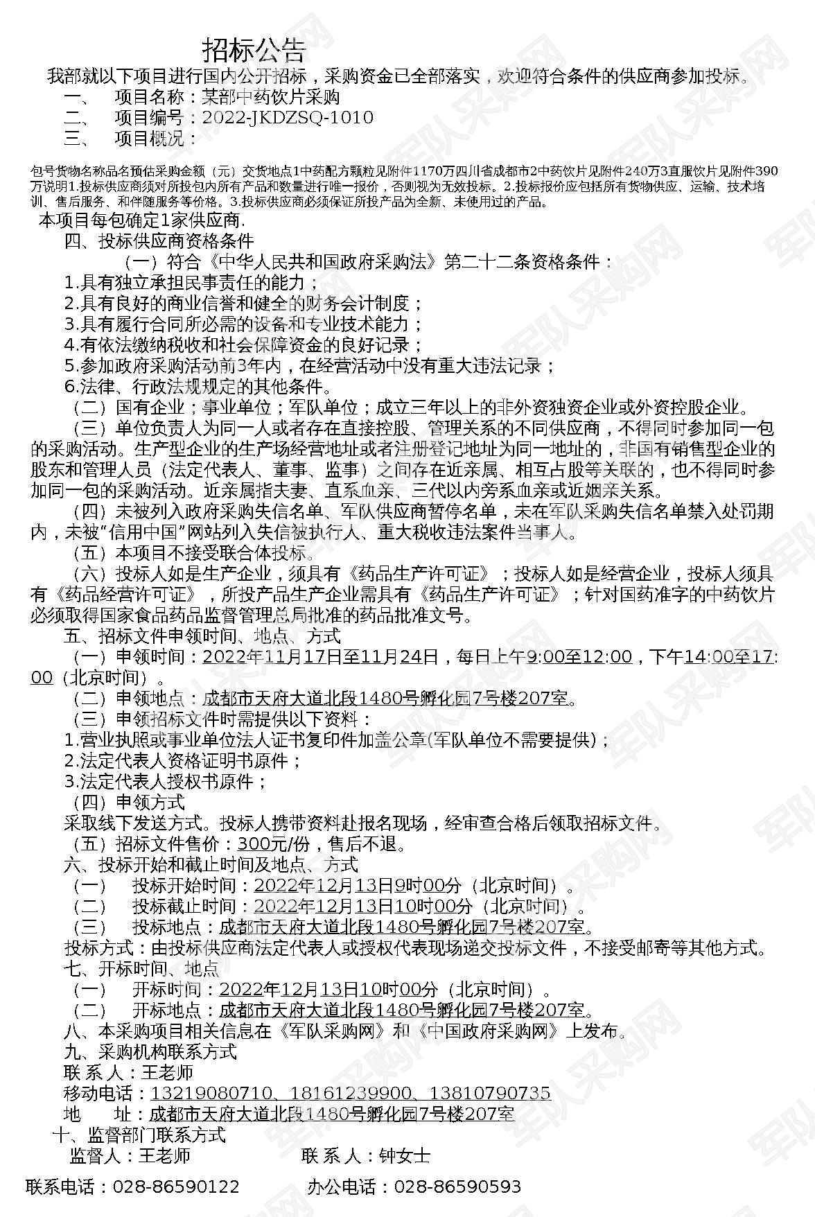 【军队采购】军队采购网某部中药饮片采购公告2022-JKDZSQ-1010