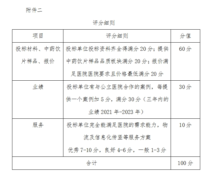 (三)拟中标人的确定本次招标采用百分制定量评价方法,满分值为100分,医院成立中药饮片评标专家组,根据各投标人投标资料及报价现场评分,结合企业商务、技术、价格等方面进行评估打分,综合评定得分第一高和第二高者中标(评标细则见附件二)。