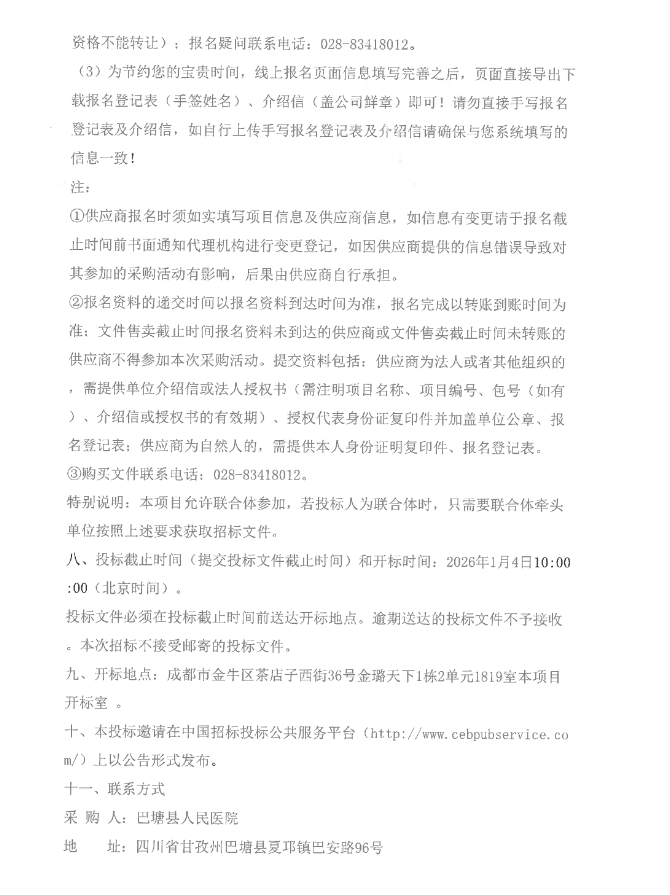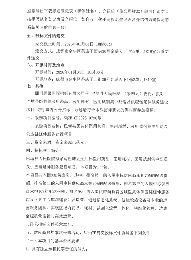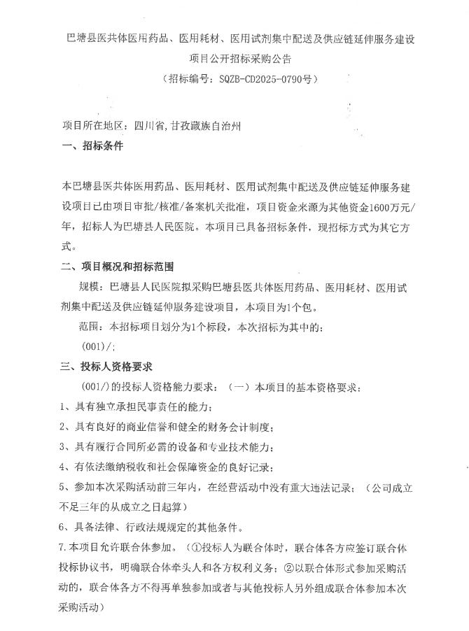 【甘孜藏族自治州巴塘县人民医院】四川省甘孜藏族自治州巴塘县医共体医用药品、医用耗材、医用试剂集中配送及供应链延伸服务建设项目公开招标采购公告