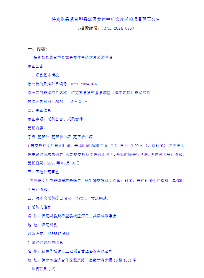 【伊犁哈萨克自治州特克斯县紧密型县域医共体】新疆维吾尔自治区伊犁哈萨克自治州特克斯县紧密型县域医共体中药饮片采购项目更正公告