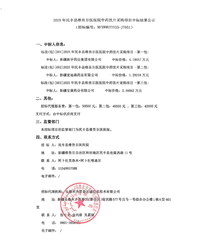 【和田地区民丰县维吾尔医医院】新疆维吾尔自治区和田地区2025年民丰县维吾尔医医院中药饮片采购项目中标结果公示