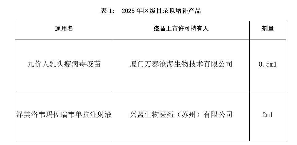 为贯彻实施《中华人民共和国疫苗管理法》和《预防接种工作规范》等法规文件要求,根据上海药品集团采购(GPO)服务网公布的2025年度上海市非免疫规划疫苗集团采购中选产品目录及《青浦区卫生健康委非免疫规划疫苗遴选管理办法》,为保障疫苗稳定供应,满足市民接种需求,有2个产品作为拟增补产品,见表1。