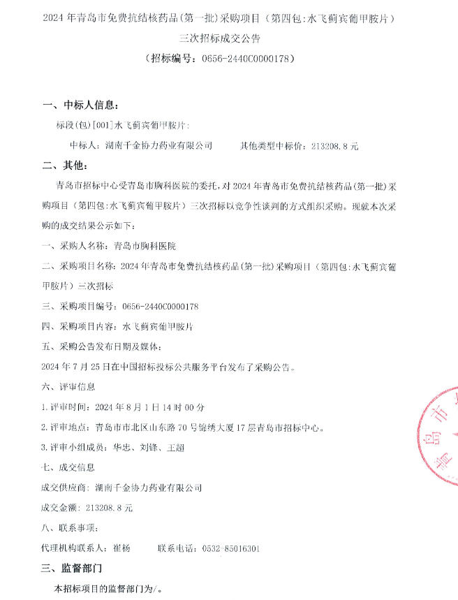 【青岛市胸科医院】山东省2024年青岛市免费抗结核药品(第一批)采购项目(第四包:水飞蓟宾葡甲胺片)三次招标成交公告