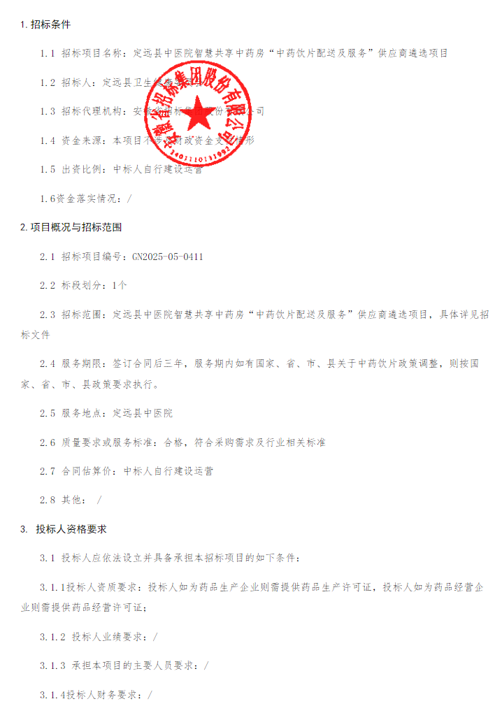 【西安市长安区定远县中医院】陕西省西安市长安区定远县中医院智慧共享中药房“中药饮片配送及服务”供应商遴选项目招标公告