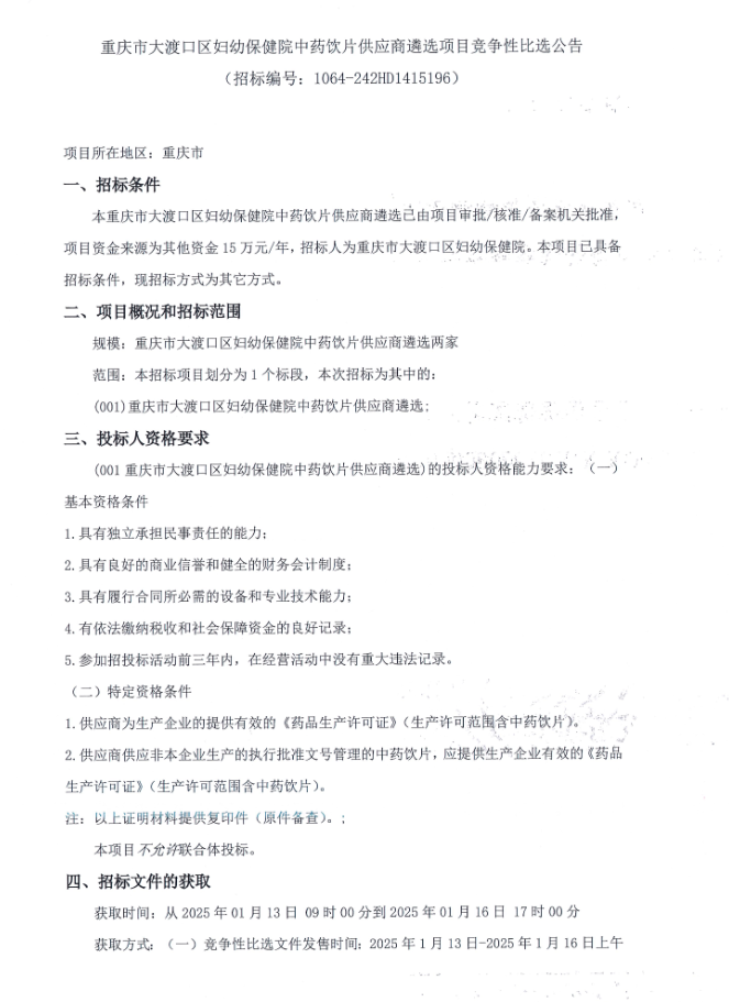 【重庆市大渡口区妇幼保健院】重庆市大渡口区妇幼保健院中药饮片供应商遴选项目竞争性比选公告