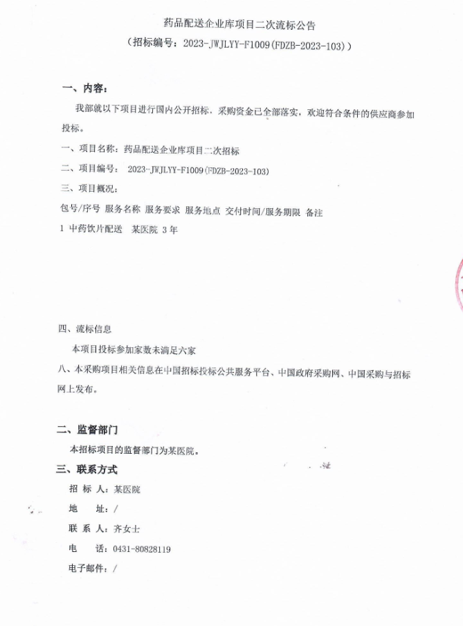 【长春市某医院】吉林省长春市某医院药品配送企业库项目二次流标公告