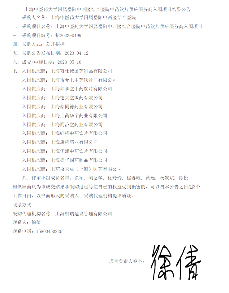【上海中医药大学附属岳阳中西医结合医院】上海中医药大学附属岳阳中西医结合医院中药饮片供应服务商入围项目结果公告