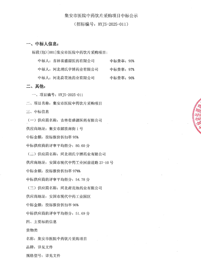 【通化市集安市医院】吉林省集安市医院中药饮片采购项目中标公示