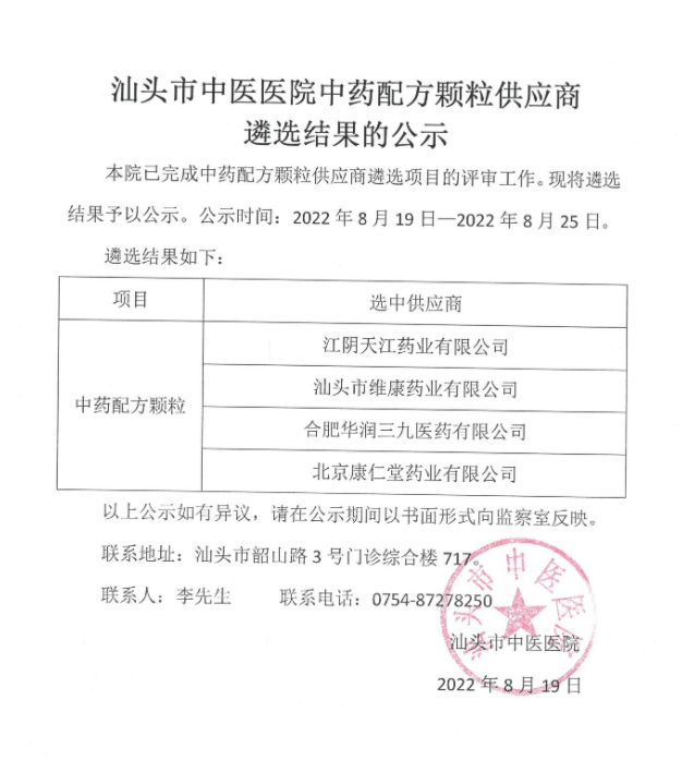 【汕头市中医医院】中药配方颗粒供应商遴选结果的公示