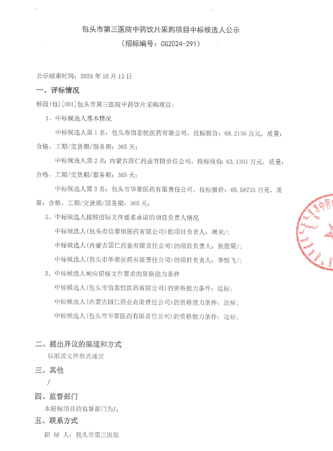 【包头市第三医院】内蒙古自治区包头市第三医院中药饮片采购项目中标候选人公示