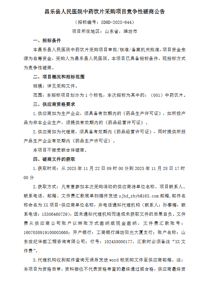 【潍坊市昌乐县人民医院】山东省潍坊市昌乐县人民医院中药饮片采购项目竞争性磋商公告