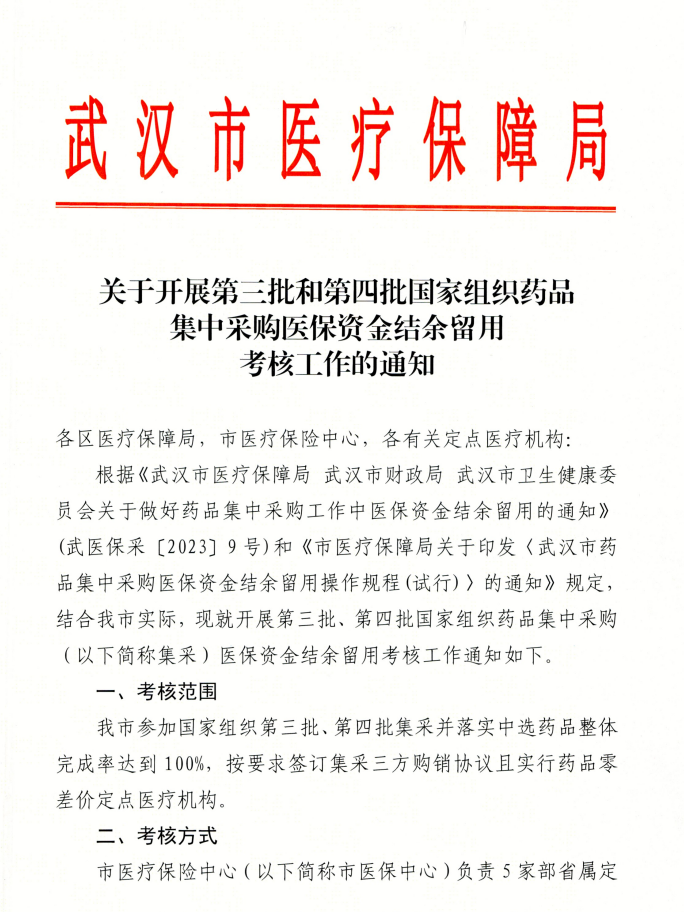 【武汉】关于开展第三批和第四批国家组织药品集中采购医保资金结余留用考核工作的通知