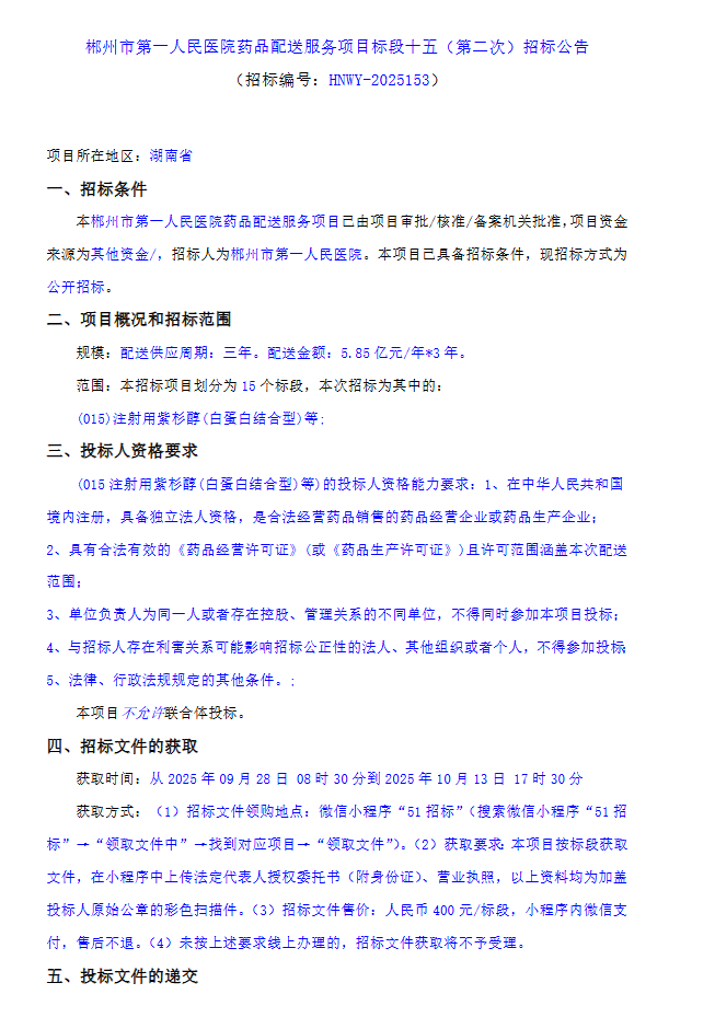 【郴州市第一人民医院】湖南省郴州市第一人民医院药品配送服务项目标段十五(第二次)招标公告
