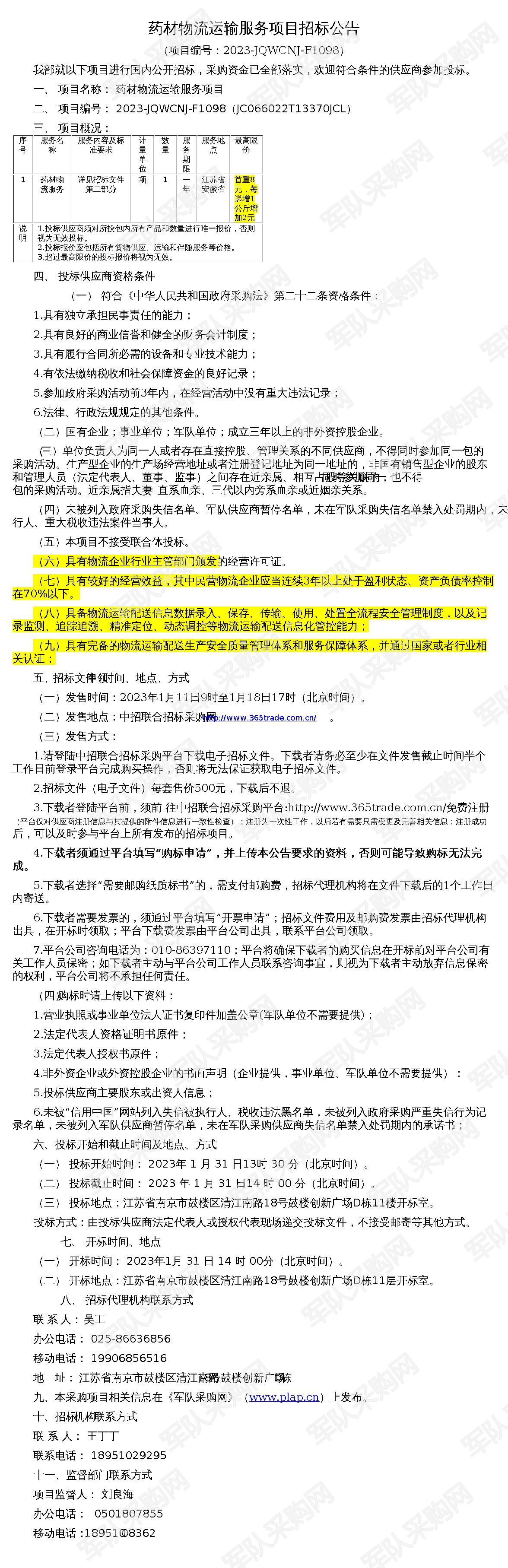 【军队采购】军队采购网药材物流运输服务项目招标公告2023-JQWCNJ-F1098