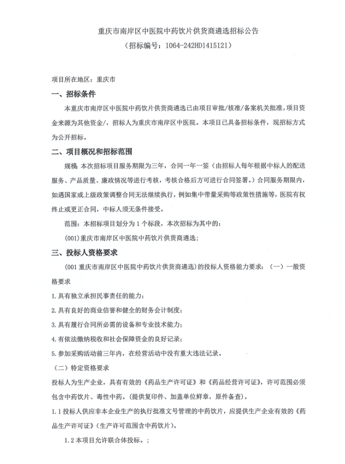 【重庆市南岸区中医院】重庆市南岸区中医院中药饮片供货商遴选招标公告