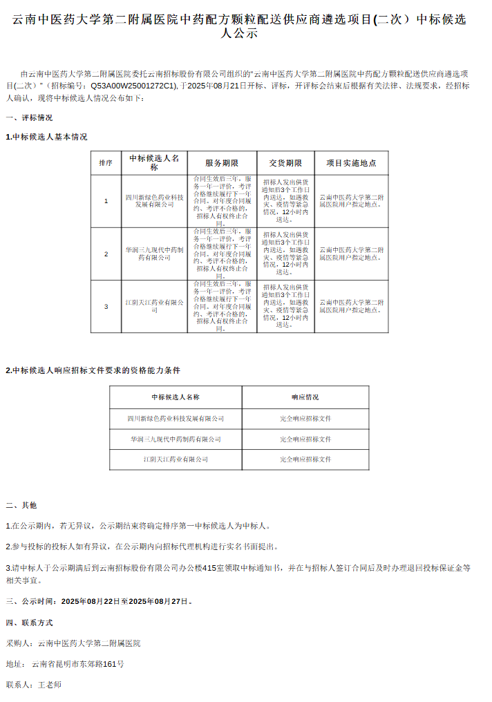 【云南中医药大学第二附属医院】云南中医药大学第二附属医院中药配方颗粒配送供应商遴选项目(二次)中标候选人公示