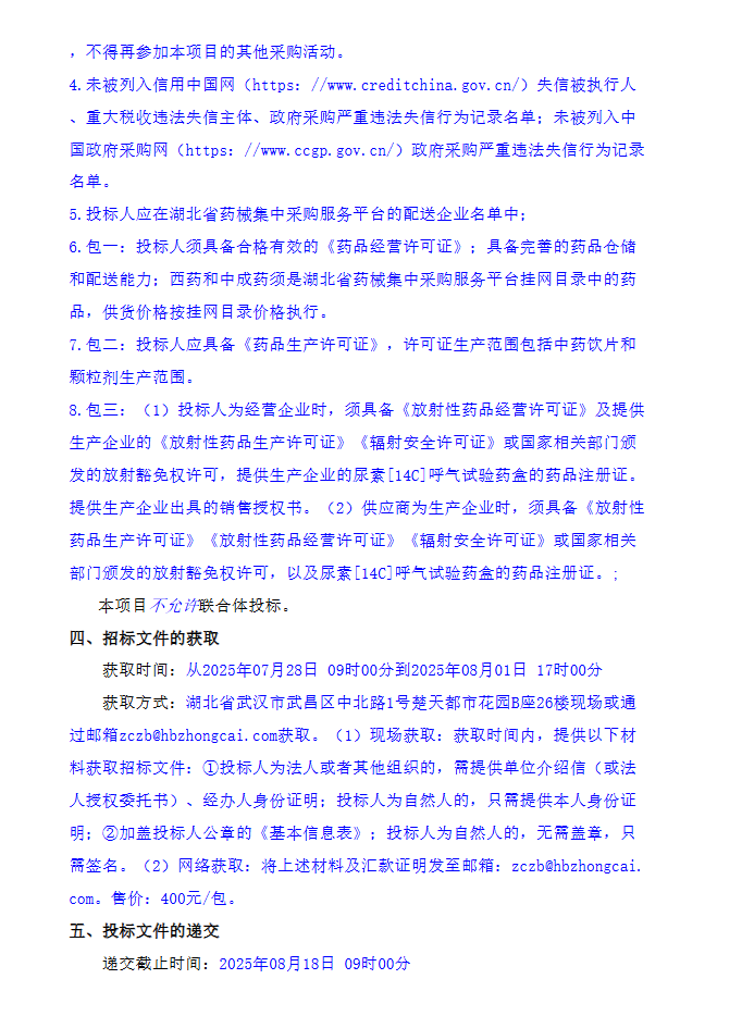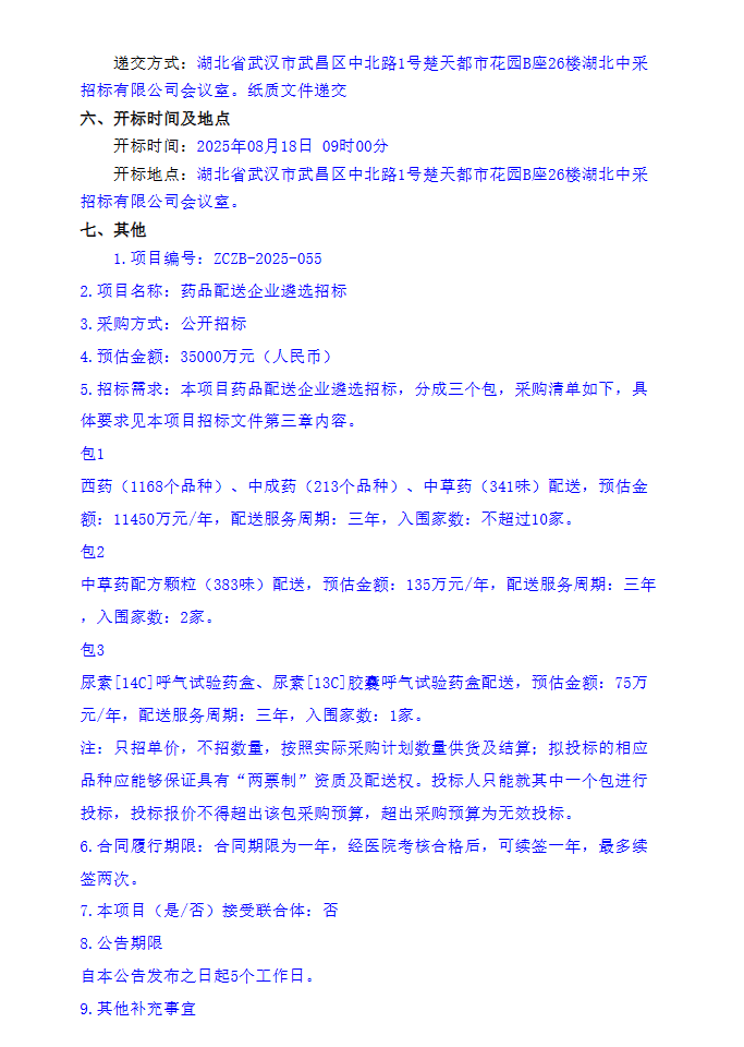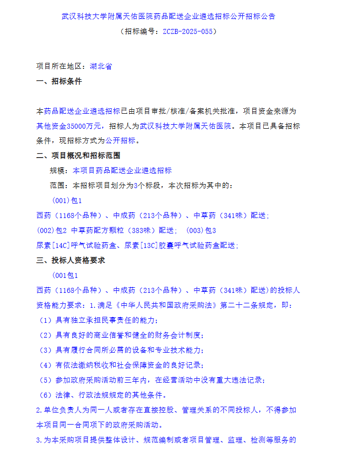 【武汉科技大学附属天佑医院】湖北省武汉科技大学附属天佑医院药品配送企业遴选招标公开招标公告