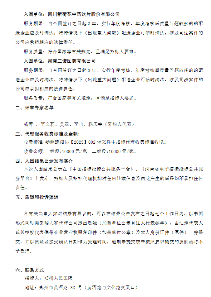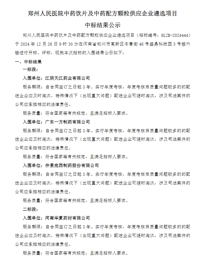 【郑州人民医院】河南省郑州人民医院中药饮片及中药配方颗粒供应企业遴选项目-中标结果公示