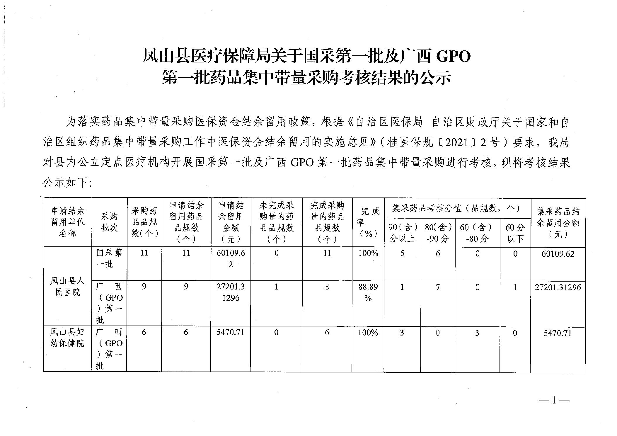 (桂医保规〔2021〕2号)要求,我局对县内公立定点医疗机构开展国采第一批及广西GPO第一批药品集中带量采购进行考核,现将考核结果公示如下∶