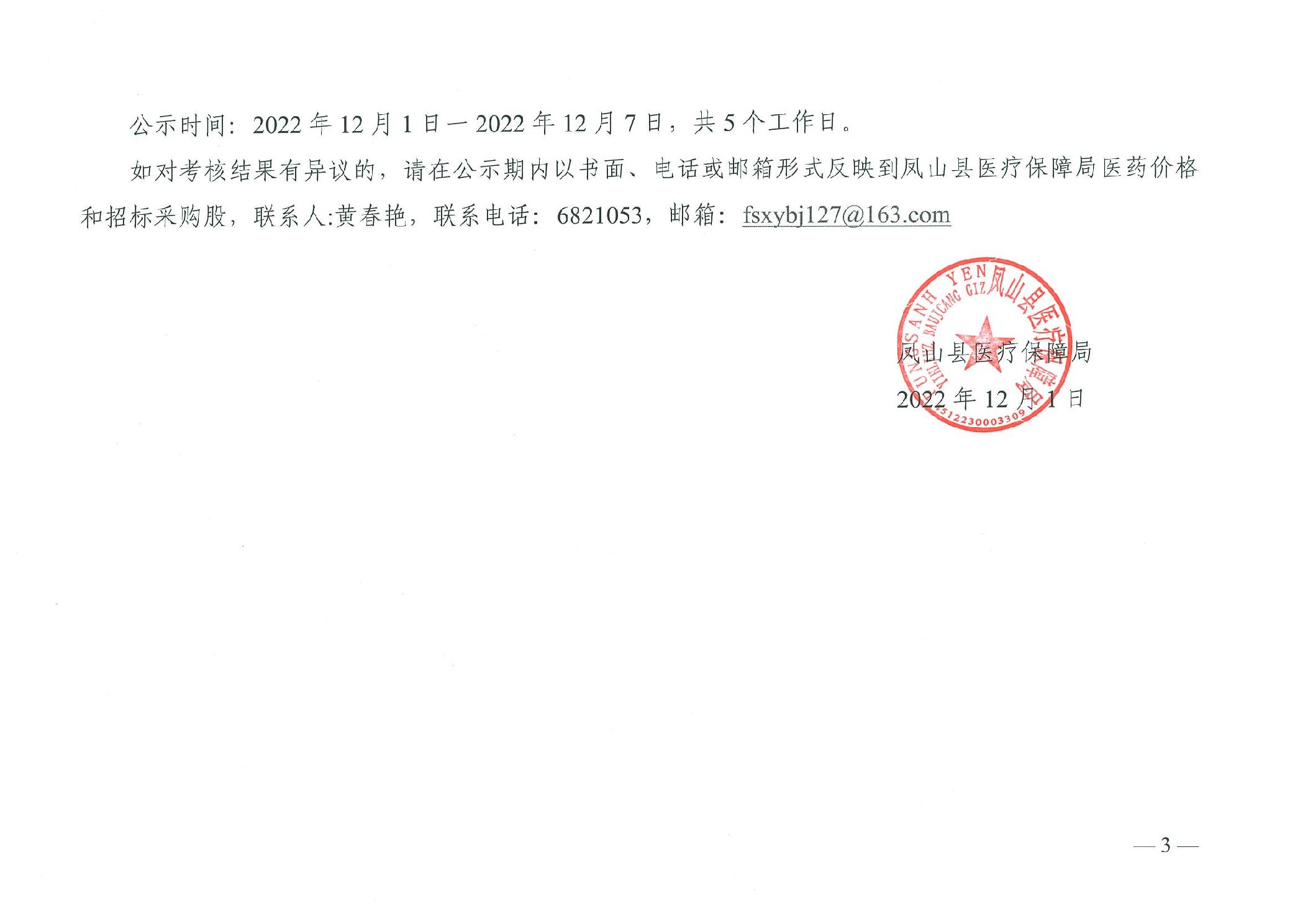 如对考核结果有异议的,请在公示期内以书面、电话或邮箱形式反映到凤山县医疗保障局医药价格和招标采购股,
