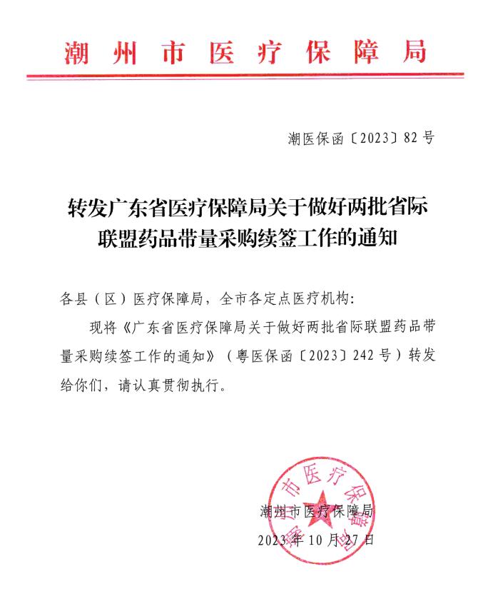 【潮州】潮医保函〔2023〕82号 转发广东省医疗保障局关于做好两批省际联盟药品带量采购续签工作的通知