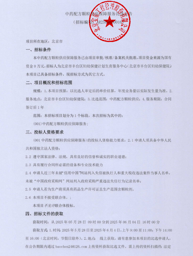 【北京市丰台区妇幼保健计划生育服务中心】北京市丰台区妇幼保健计划生育服务中心(北京市丰台区妇幼保健院)中药配方颗粒供应保障服务比选公告(20250527)