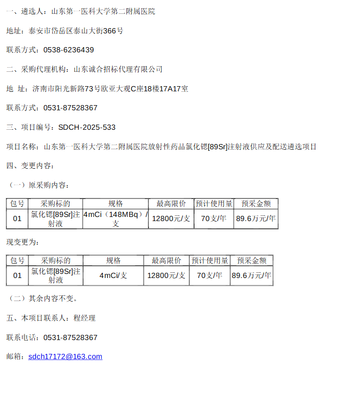 【山东第一医科大学第二附属医院】山东第一医科大学第二附属医院放射性药品氯化锶[89Sr]注射液供应及配送遴选项目变更公告