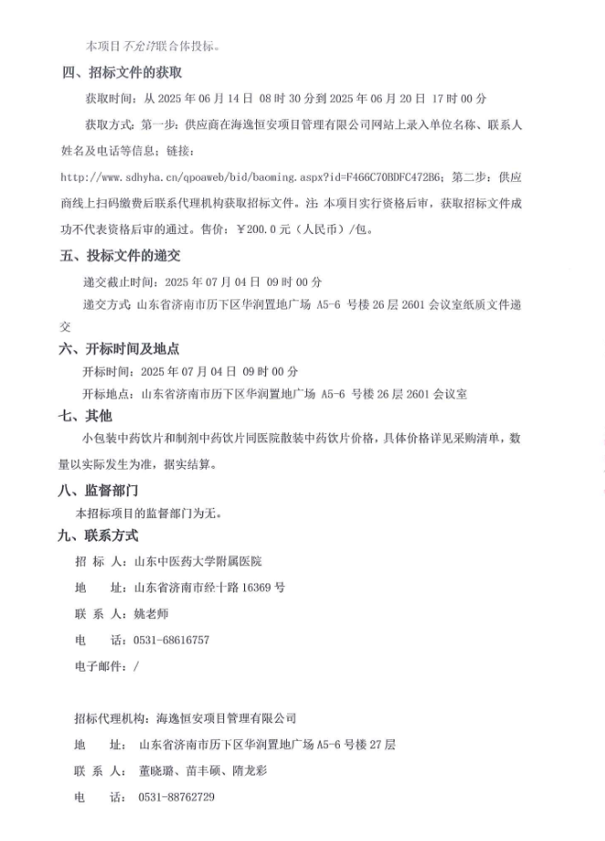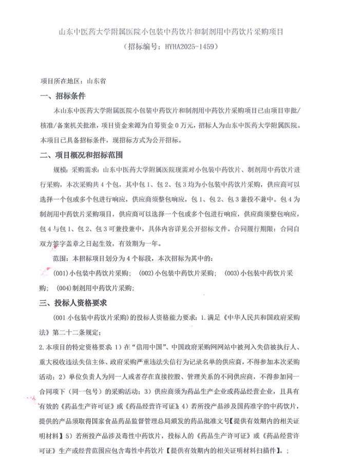 【山东中医药大学附属医院】山东中医药大学附属医院小包装中药饮片和制剂用中药饮片采购项目