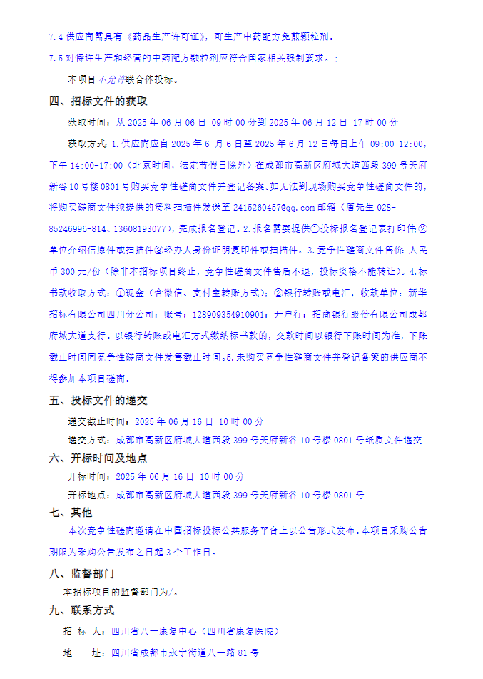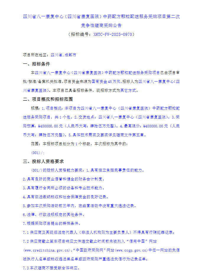 【四川省八一康复中心】四川省八一康复中心(四川省康复医院)中药配方颗粒配送服务采购项目第二次竞争性磋商采购公告