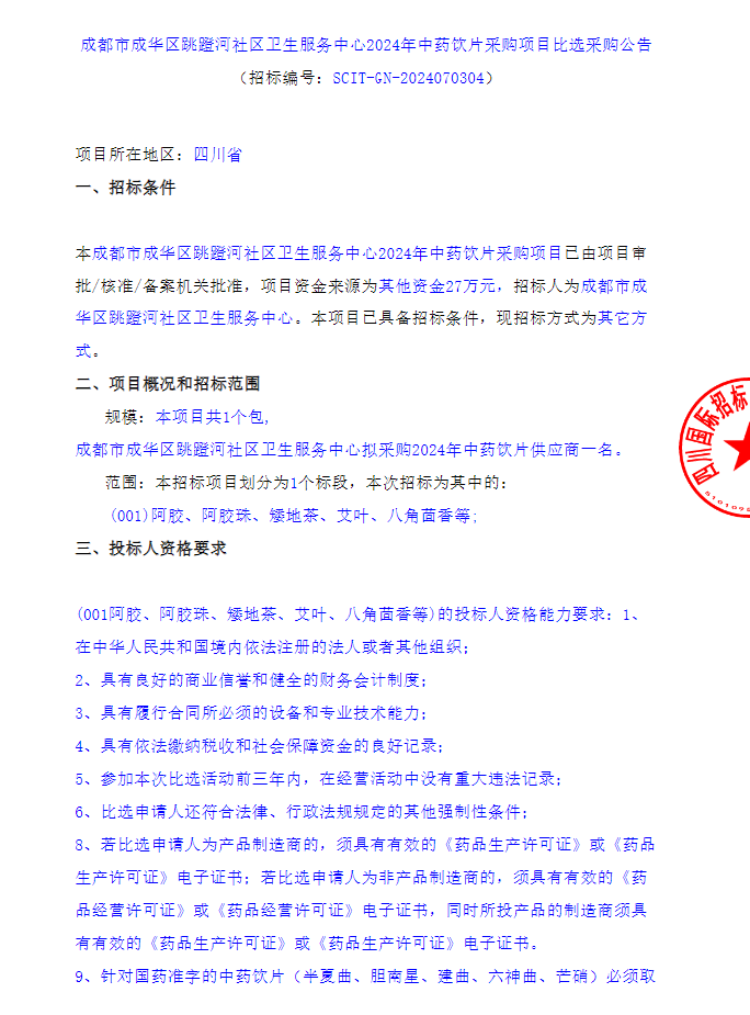 【成都市成华区跳蹬河社区卫生服务中心】四川省成都市成华区跳蹬河社区卫生服务中心2024年中药饮片采购项目比选采购公告