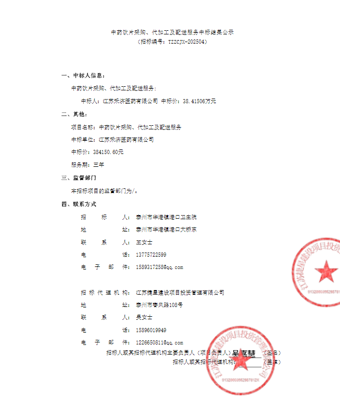 【泰州市华港镇港口卫生院】江苏省泰州市华港镇港口卫生院中药饮片采购、代加工及配送服务中标结果公示
