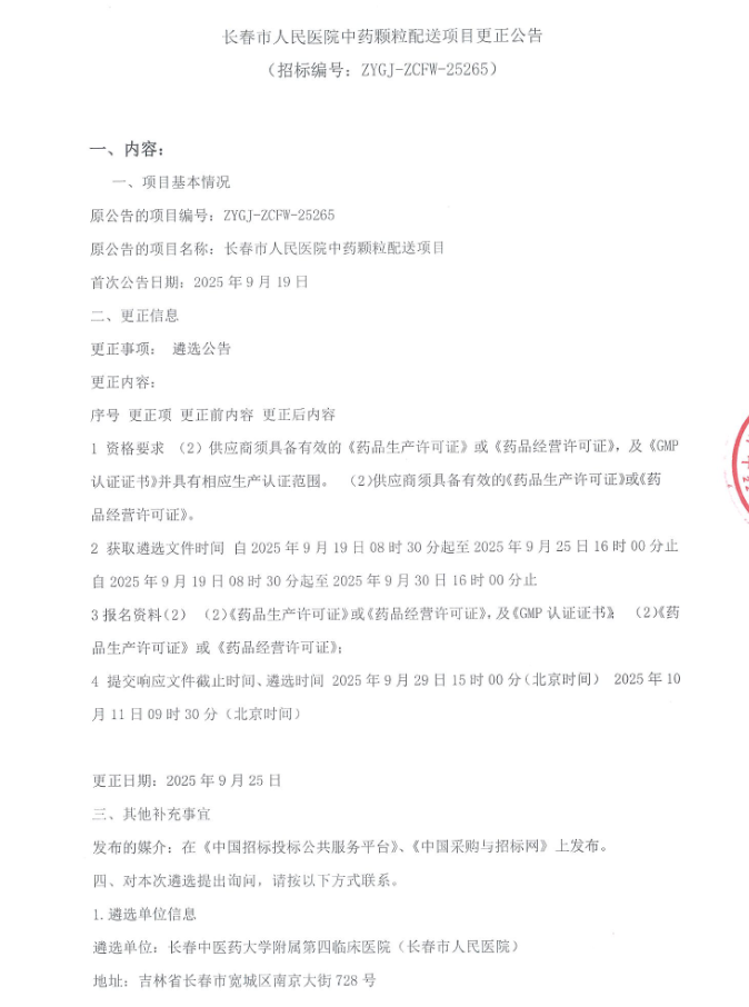 【长春市人民医院】吉林省长春市人民医院中药颗粒配送项目更正公告