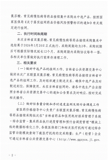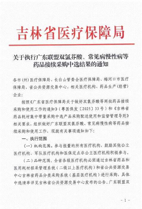 【吉林】关于执行广东联盟双氯芬酸、常见病慢性病等药品接续采购中选结果的通知